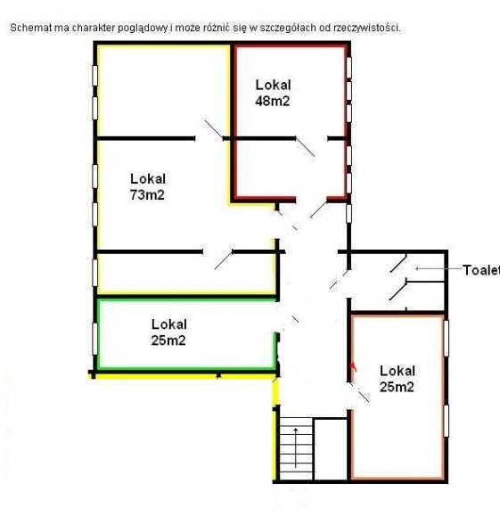 toalety (1 łazienka bezpośrednio w największym lokalu biurowym). Okna